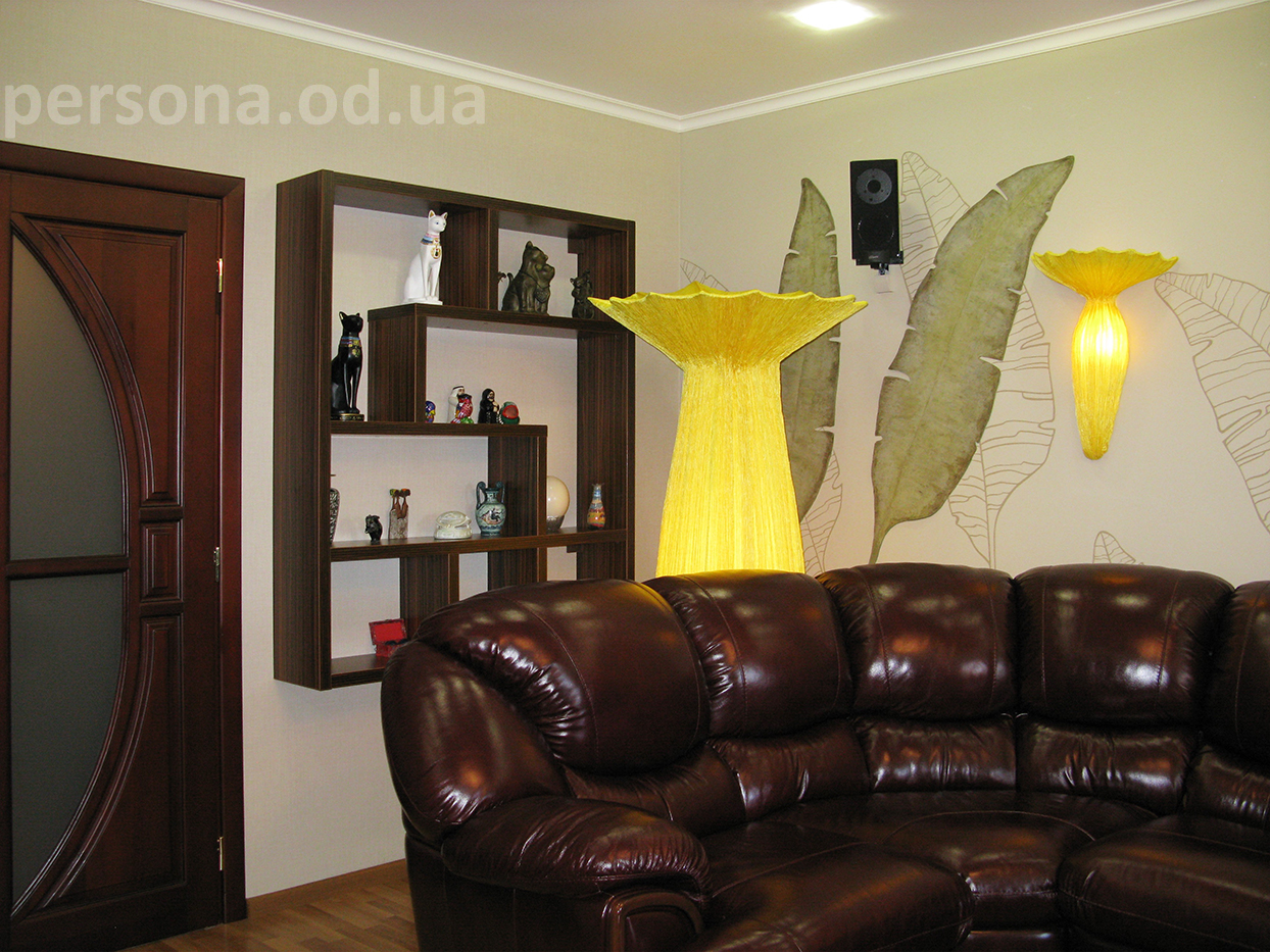 Футуристические нотки в интерьере завораживают и притягивают взгляд. Разнообразные подсветки, нестандартные линии разбивают монотонность интерьера гостиной. Есть чем удивить гостей!