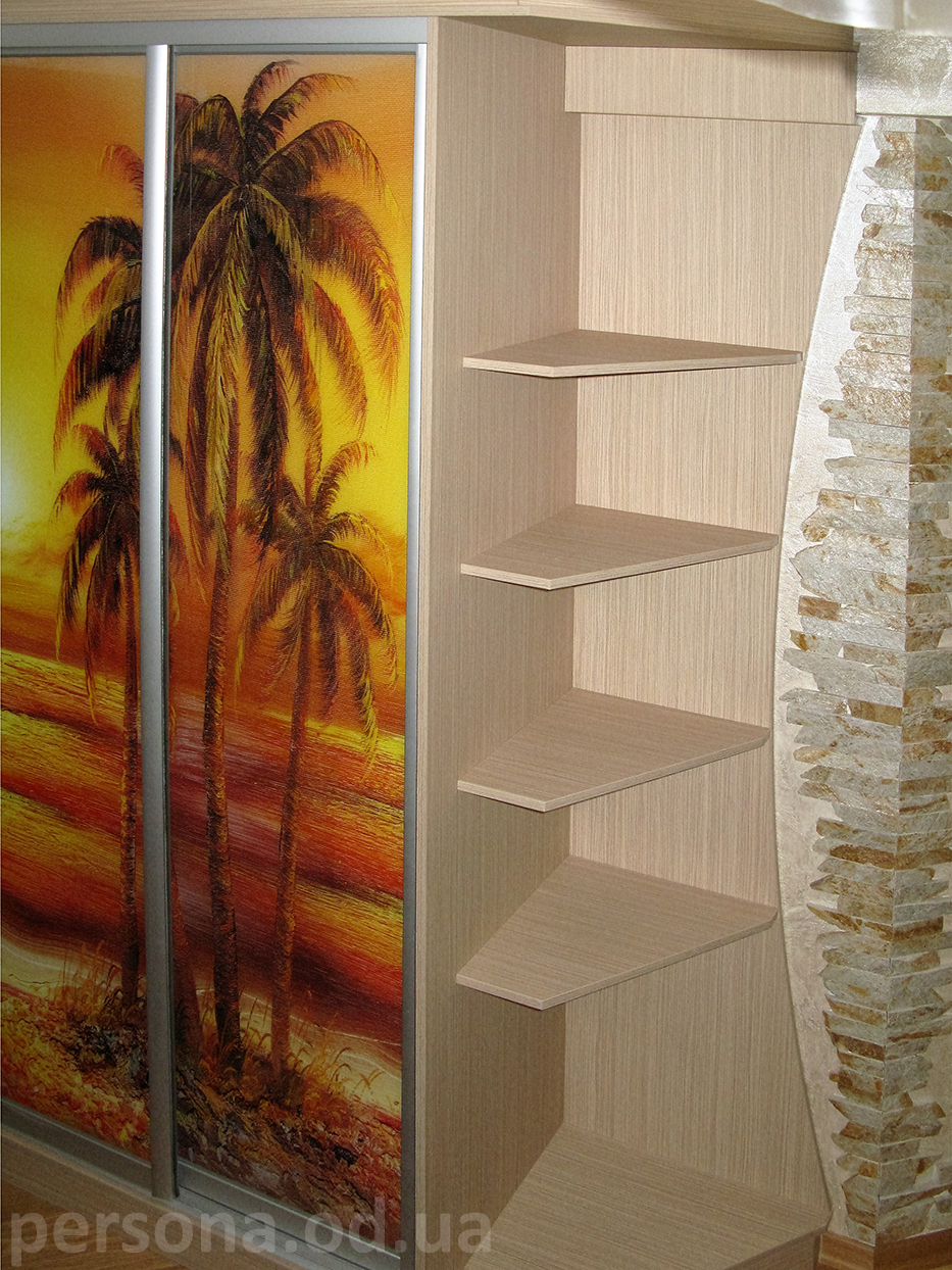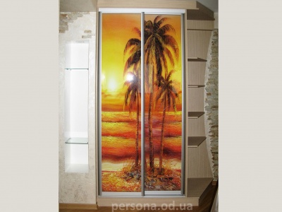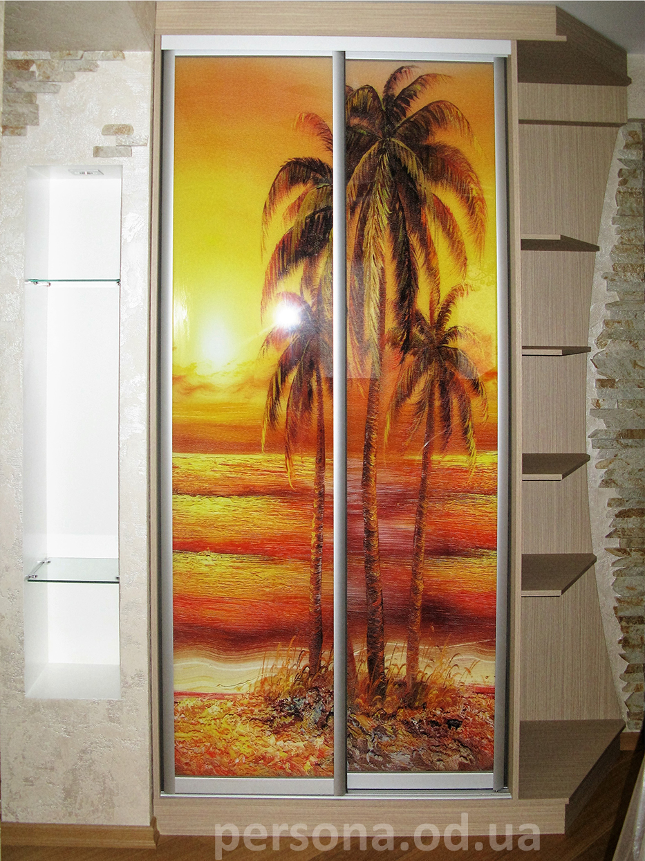 Шкаф-купе с сочным экзотическим рисунком навевает самое романтическое настроение. В воздухе пахнет морем и счастьем. Интерьер прихожей создан вместе со шкафом.