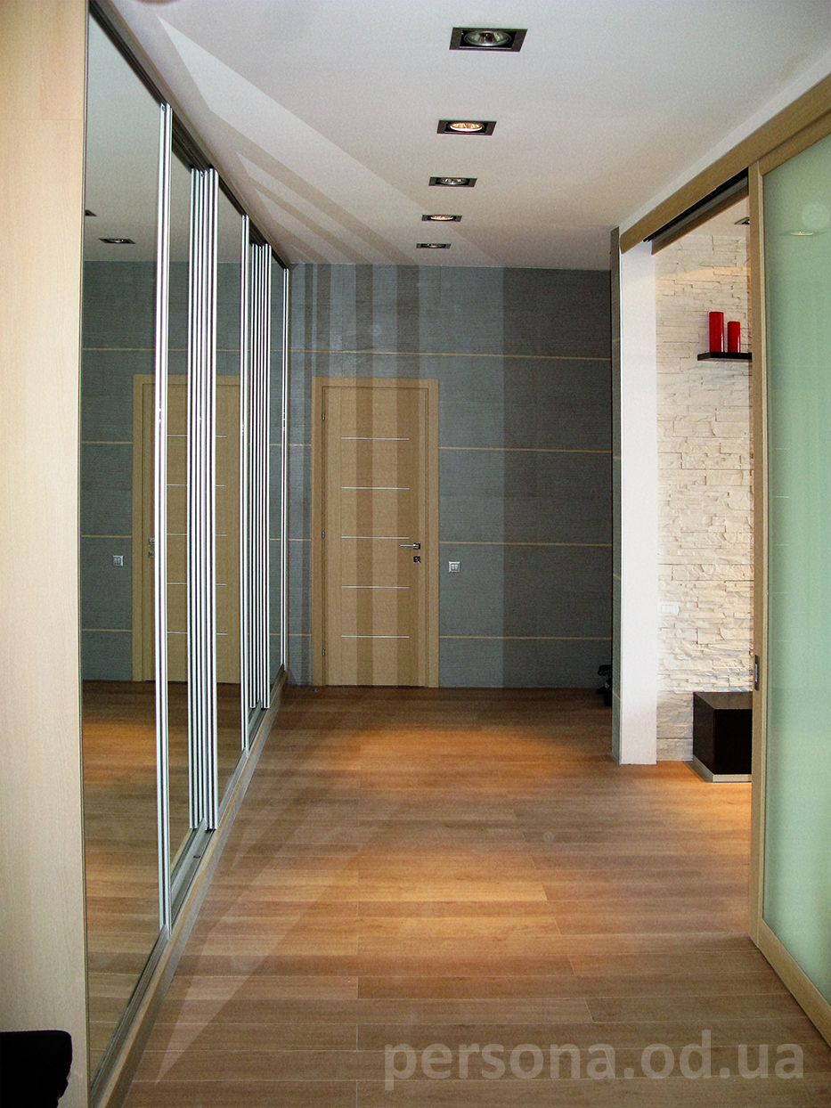 Пятиметровый шкаф-купе на пять дверей. Зеркала отражают всю квартиру, увеличивая ее вдвое. Такой вариант дверей всегда актуален, вхож в любой интерьер, практичен и удобен - отовсюду видно себя любимого (или любимую:)