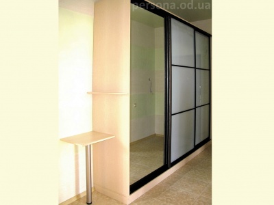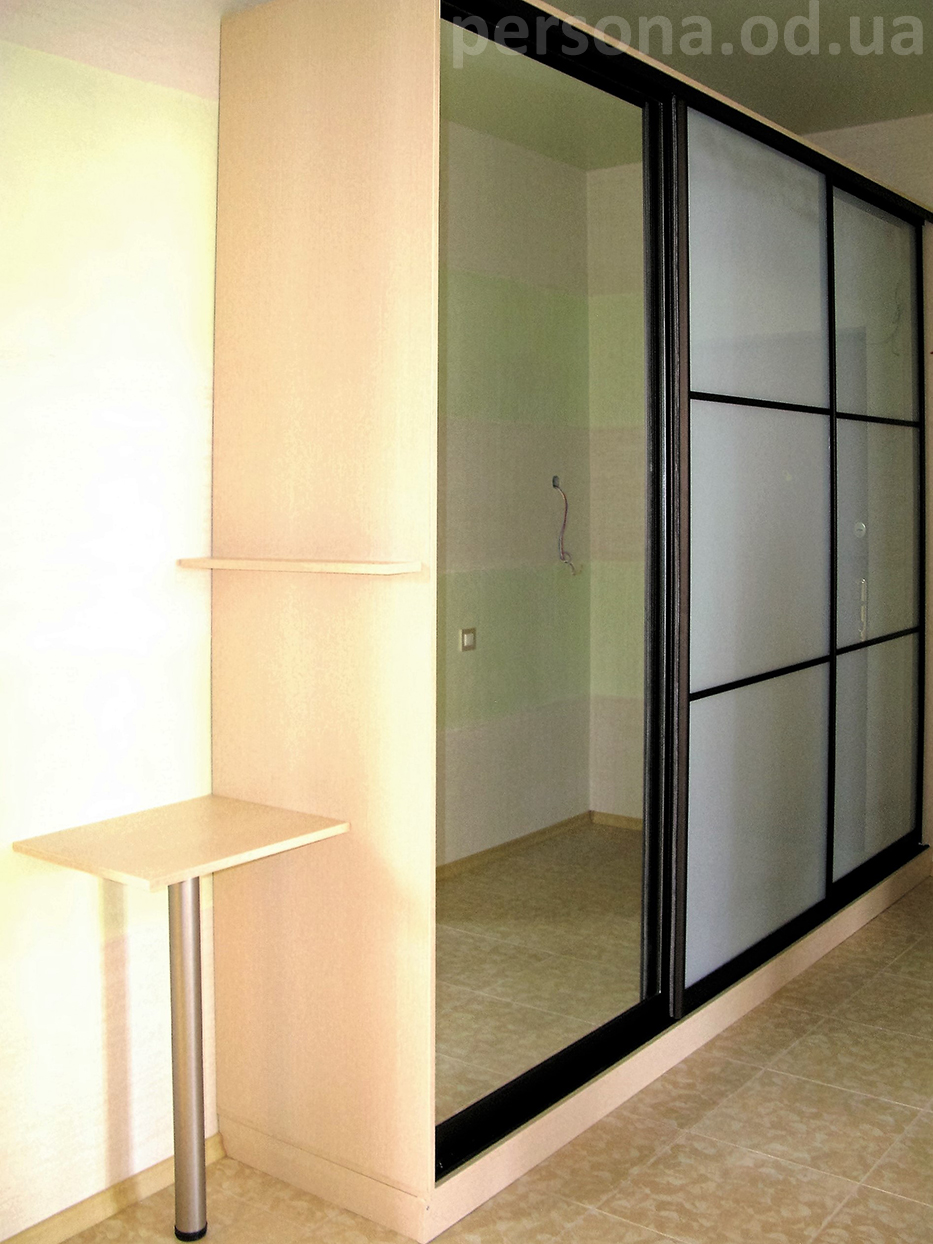 Достаточно нестандартное решение шкафа-купе. Зона входа оформлена для максимального удобства входящего. Столик для сумок-ключей-телефонов, полочка для необходимых мелочей и большое зеркало.