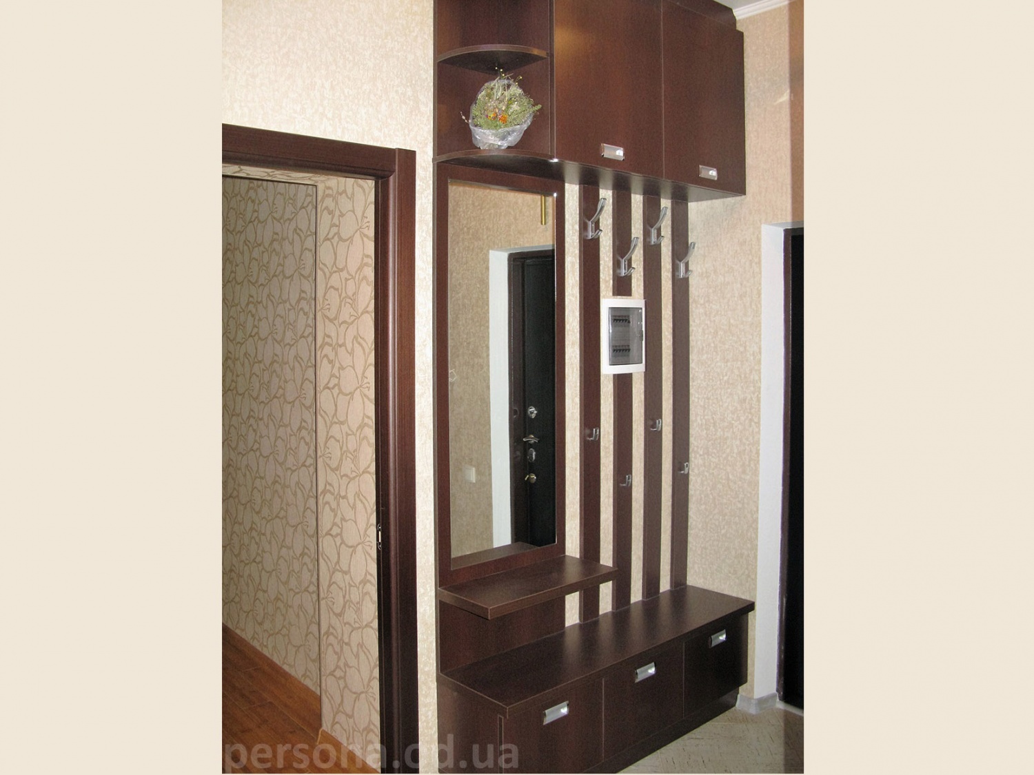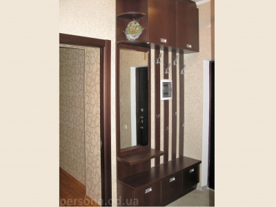Вешалка с зеркалом. Врезные ручки не мешают движению в узкой прихожей. Шкафчики сверху помогают рационально использовать пространство.