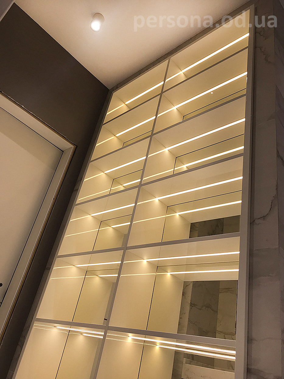 В современной квартире все должно быть прекрасно - и кухня, и гостиная, и конечно же, санузел. Подсветка в стеллаже удобна и оживляет интерьер. Зеркала на задней стенке шкафа визуально углубляют и увеличивают количество света вдвое. Современно, красиво и удобно.